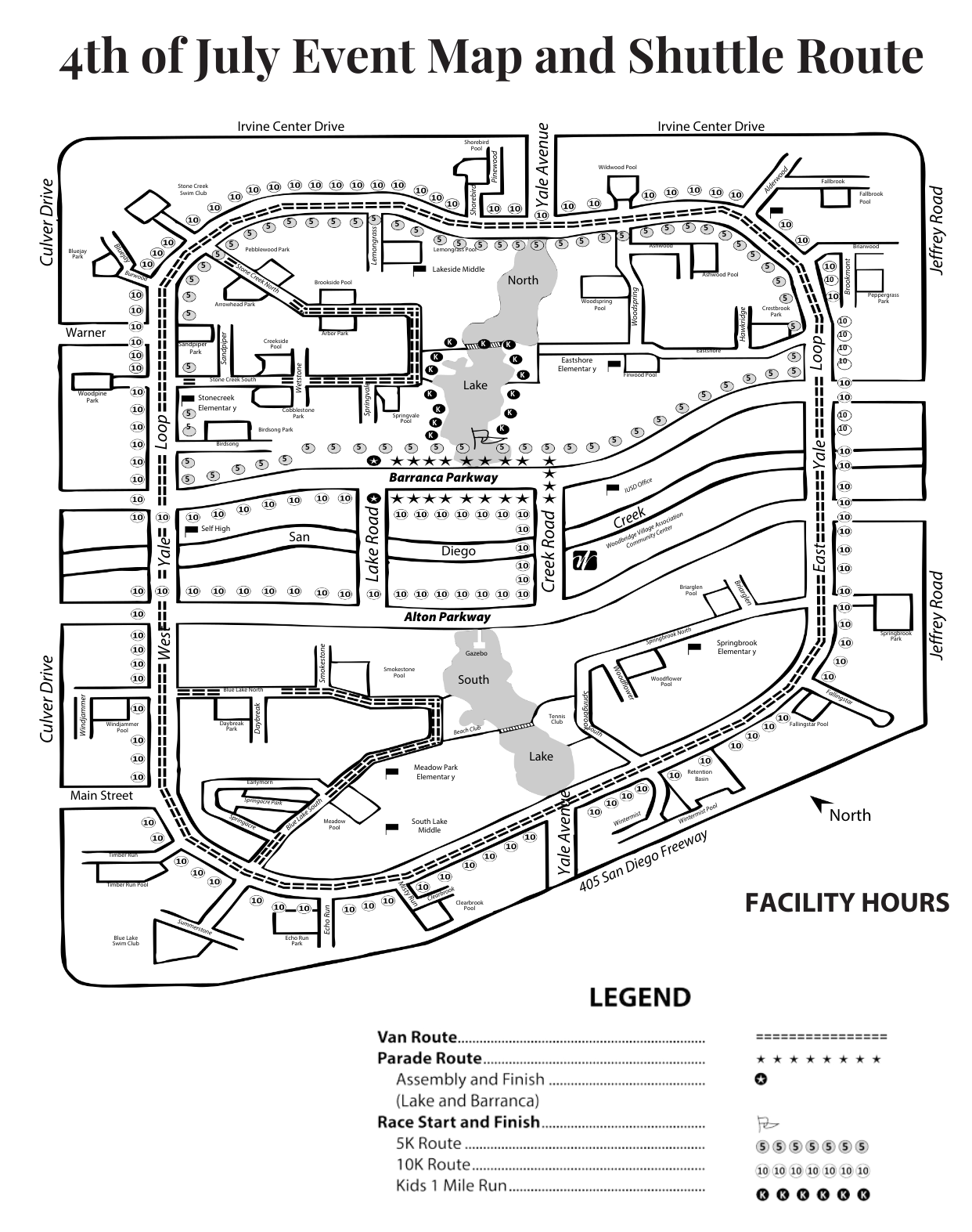 Race Registration: All registrations will be handled online for the races. Please note the last day to register will be Friday, July 3rd at noon. No registration will be accepted after July 3rd at noon, or on the day of the race. This year's courses will start as always by the North Lake Gazebo on Barranca Parkway.